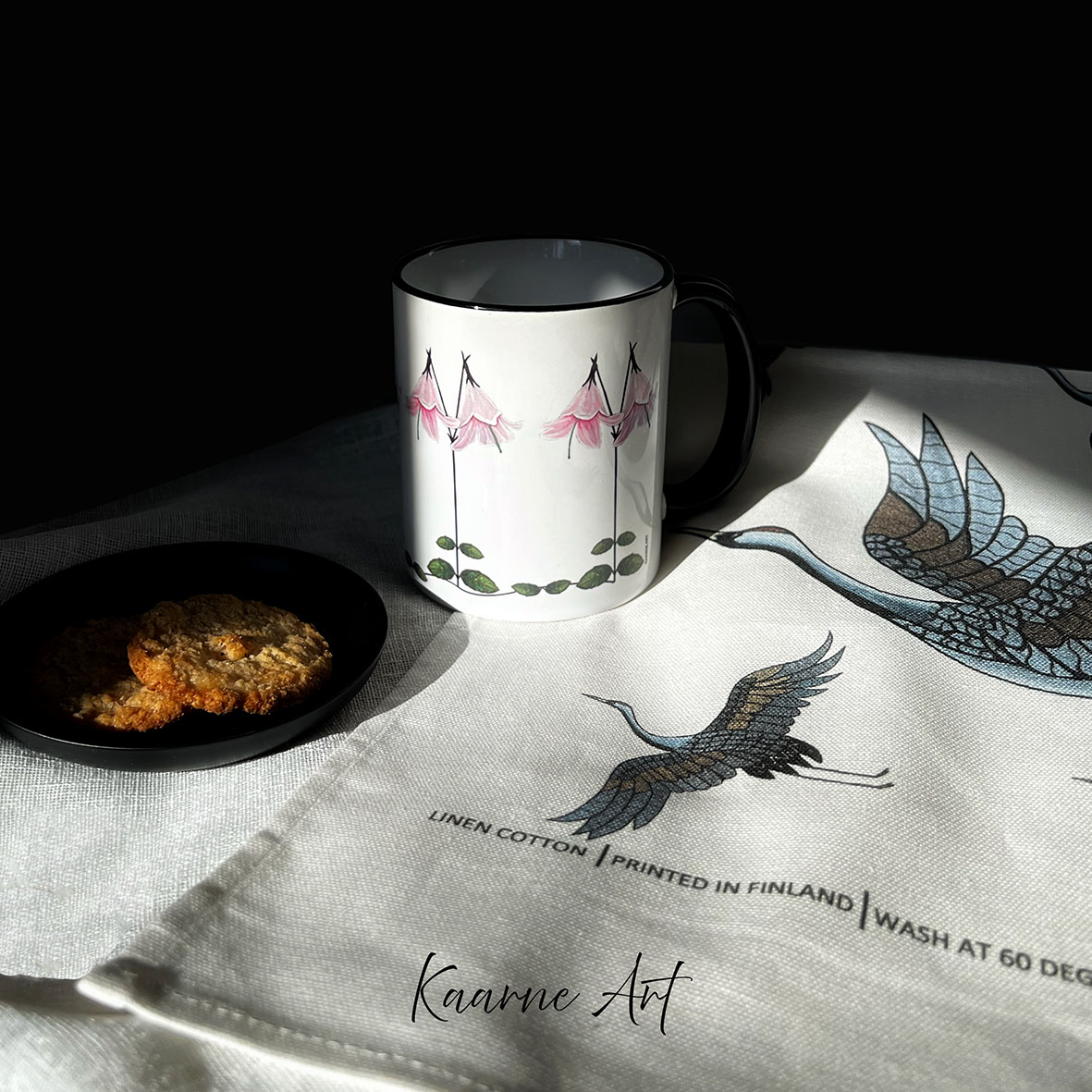 Illustration on both sides of the mug. The ceramic mugs are dishwasher safe and microwave safe. All mugs are hand-printed in Finland. Capacity: 2.9 dl. All the images on my products are my own original works. The acrylic paintings that serve as the basis for these images are also available for purchase. My works can be found on the page Art by Tanja Vuorinen. For inquiries, please use the contact form: Contact form